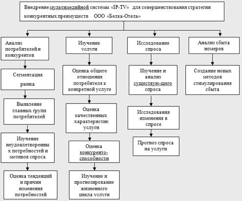 Гостиница ООО "Белка-Отель" располагает всеми необходимыми ресурсами для совершенствования стратегии конкурентных преимуществ. Это и достаточно квалифицированный персонал, и финансовые средства, и техническое оснащение компании. Для внедрения мультимедийной системы необходимо построить дерево целей. Дерево целей – это структурированная, построенная по иерархическому принципу совокупность целей экономической системы, программы, плана, в которой выделены генеральная цель ("вершина дерева") и подчиненные ей подцели первого, второго и последующих уровней ("ветви дерева"). Когда составлено дерево, можно просмотреть, к чему приведет та или иная цель. Таким образом, основными целями для реализации проекта совершенствования стратегии конкурентных преимуществ являются анализ потребителей и конкурентов, изучение качественных и количественных характеристик предлагаемых услуг, исследование и стимулирование спроса. Конечными целями будут: оценка тенденций и причин изменения потребностей, оценка возможности вывода на рынок новой услуги, прогноз спроса на услуги. Дерево целей по внедрению мультимедийной системы "IP-TV" представлено на рис. 5.